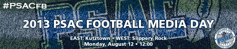 PSAC 2013 Football Media Day Wednesday, August 7, 2013 9:00 AM Need to Know Preseason Poll Release 2013 PSAC Preseason Football Notes Media Day Announcement 2013 Composite Schedule 2012 Final Standings 2012 Stats Preseason Poll Eastern Division 1. Shippensburg (6) 2. Bloomsburg (1) 3. West Chester (1) 4. Kutztown 5. East Stroudsburg 6. Lock Haven 7. Millersville 8. Cheyney Western Division 1. IUP (7) 2. Mercyhurst (1) 3. Slippery Rock 4. California 5. Gannon 6. Edinboro 7. Clarion 8. Seton Hill EAST: KUTZTOWN WEST: SLIPPERY ROCK Who will be there? Who will be there? Bloomsburg Follow @BUSportsinfo HC: Paul Darragh OL Chris Steck Sr. LB Justin Shirk Jr. Cheyney Follow @CUWolves HC: Ken Lockard LB Isaiah Fleming Jr. OL Mike McGlashen Jr. East Stroudsburg Follow @ESUWarriors HC: Denny Douds DL Bryan Thomson R-Jr. QB Matt Soltes R-So. Kutztown Follow @KUGoldenBears HC: Drew Folmar DE Zach Greenwald Jr. OL Chase Fraley R-Sr. Lock Haven Follow @HavenAthletics HC: John Allen RB Brandon Brader Sr. DL Kyle White Sr. Millersville Follow @MarauderNews HC: Greg Breitbach WR Dominic Sanders R-Sr. LB Reggie Slaton R-Jr. Shippensburg Follow @ShipURaiders HC: Mark "Mac" Maciejewski QB Zach Zulli Sr. DL Jake Metz Sr. West Chester Follow @WCUAthletics HC: Bill Zwaan OL Trey Farmer Sr. RB Rondell White Sr. California Follow @calvulcans HC: Mike Kellar OL Jack Abercrombie Jr. DB Dewey McDonald R-Sr. Clarion Follow @ClarionEagles HC: Jay Foster DE Adam Bostick Sr. OT Mike Felker Sr. Edinboro Follow @BoroAthletics HC: Scott Browning DT Chris Williams Sr. WR Marcus Johnson Sr. Gannon Follow @GUKnights HC: Brad Rzyczycki WR Abraham Ocasio Jr. LB Luke Rankie R-Jr. IUP Follow @IUPCrimsonHawk HC: Curt Cignetti WR Terrill Barnes Sr. LB Alexander Berdahl Sr. Mercyhurst Follow @HurstAthletics HC: Marty Schaetzle QB Anthony Vendemia R-Sr. DL Dustin Galich Sr. Seton Hill Follow @GriffinsSports HC: Isaac Collins QB Andrew Jackson Sr. LB Tyler Zimmer Jr. Slippery Rock Follow @Rock_Athletics HC: George Mihalik DE Tony Papley Sr. CB Anthony Saunders Sr. What are the PSAC football coaches thoughts on the upcoming season? PSAC Football Media Day Photo Gallery PSAC Football Media Day - 85 Gallery Can't View the gallery? Click here. Follow PSAC Football Media Day