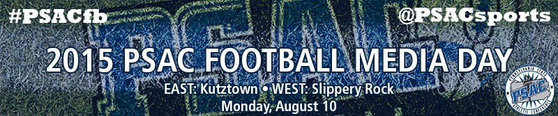 2015 PSAC Football Media Day Wednesday, August 5, 2015 10:22 AM PSAC FOOTBALL MEDIA DAY: Monday, August 10 starting at 12:00 p.m. NEED TO KNOW Preseason Poll Release 2015 PSAC Preseason Football Notes Media Day Announcement 2015 Composite Schedule 2014 Final Standings 2014 Statistics EAST: KUTZTOWN WEST: SLIPPERY ROCK Old Main: Georgian Room Robert M. Smith Student Center: Ballroom (3rd Floor) Directions | Campus Map Directions | Campus Map Who will be there? Who will be there? Bloomsburg @GoBUHuskies HC: Paul Darragh QB: Tim Kelly - R-Sr. CB: Gary Postell - R-Sr. Cheyney @CUWolves Interim HC: Chris Roulhac LB: Joe Bryant - R-Jr. OL: Mike McGlashen - Sr. East Stroudsburg @ESUWarriors HC: Denny Douds QB: Matt Soltes - R-Sr. CB: Teron Dobbs - Sr. Kutztown @KUGoldenBears HC: Jim Clements LB: Zachary Delp - Jr. WR: Kellen Williams - Jr. Lock Haven @HavenAthletics HC: Dave Taynor QB: Caleb Walton - R-Jr. LB: Tony Ballon - Sr. Millersville @VilleMarauders HC: Greg Breitbach CB: Joey Pham - Sr. OL: Lenny Sanelli - Sr. Shippensburg @ShipURaiders HC: Mark "Mac" Maciejewski OL: Hayden Rigo - Jr. LB: Allen Holman - Jr. West Chester @WCUAthletics HC: Bill Zwaan RB: Brandon Monk - Sr. DB: Brandon Pepper - Sr. California @calvulcans HC: Mike Kellar QB: James Harris - Sr. DL: Jawan Turner - Jr. Clarion @ClarionEagles HC: Chris Weibel OL: Cameron Cress - Sr. DT: Kwame Bell - Sr. Edinboro @BoroAhletics HC: Scott Browning LB: Mike Shansky - Sr. DE: Domenic Principale - Jr. Gannon @GUKnights HC: Brad Rzyczycki QB: Liam Nadley - R-Sr. WR: Jesstin Hamm - R-Sr. IUP @IUPCrimsonHawk HC: Curt Cignetti LB: Dorian Lane - Sr. LB: Kevin Clarke - Jr. Mercyhurst @HurstAthletics HC: Marty Schaetzle LB: Joe Dever - Sr. RB: Brandon Brown-Dukes - R-Sr. Seton Hill @GriffinsSports HC: Isaac Collins DB: Christian Carter - Sr. OL: Will Wright - Sr. Slippery Rock @Rock_Athletics HC: George Mihalik OL: Cory Tucker - R-Sr. DB: Derrick Fulmore - Jr. Can't view the gallery? Click here.